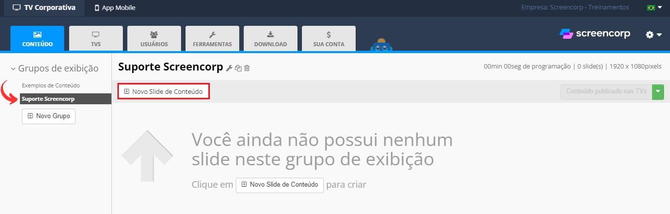 Vá até o "Grupo de exibição" desejado e clique em "Novo slide de conteúdo":