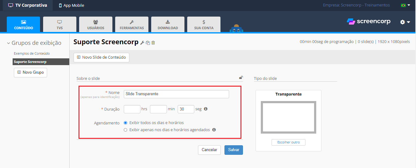 Obs.: Lembre-se que o tempo de duração desse slide deve ser o "tempo total" que o seu conteúdo aberto no navegador vai aparecer na TV.